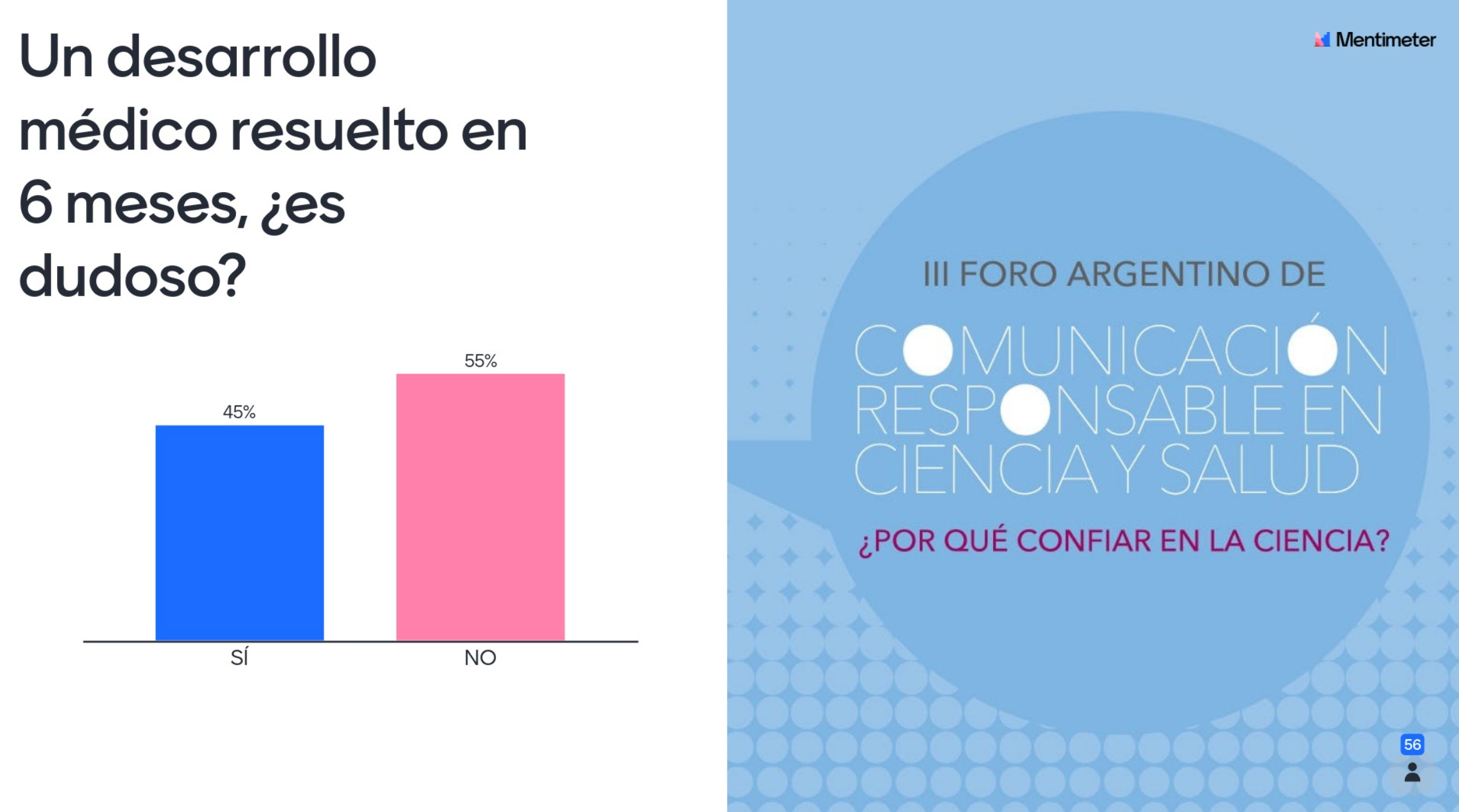 - Ante la pregunta ¿Un desarrollo médico resuelto en 6 meses es dudoso?, 45% de quienes respondieron dijo que sí y 55% dijo que no.