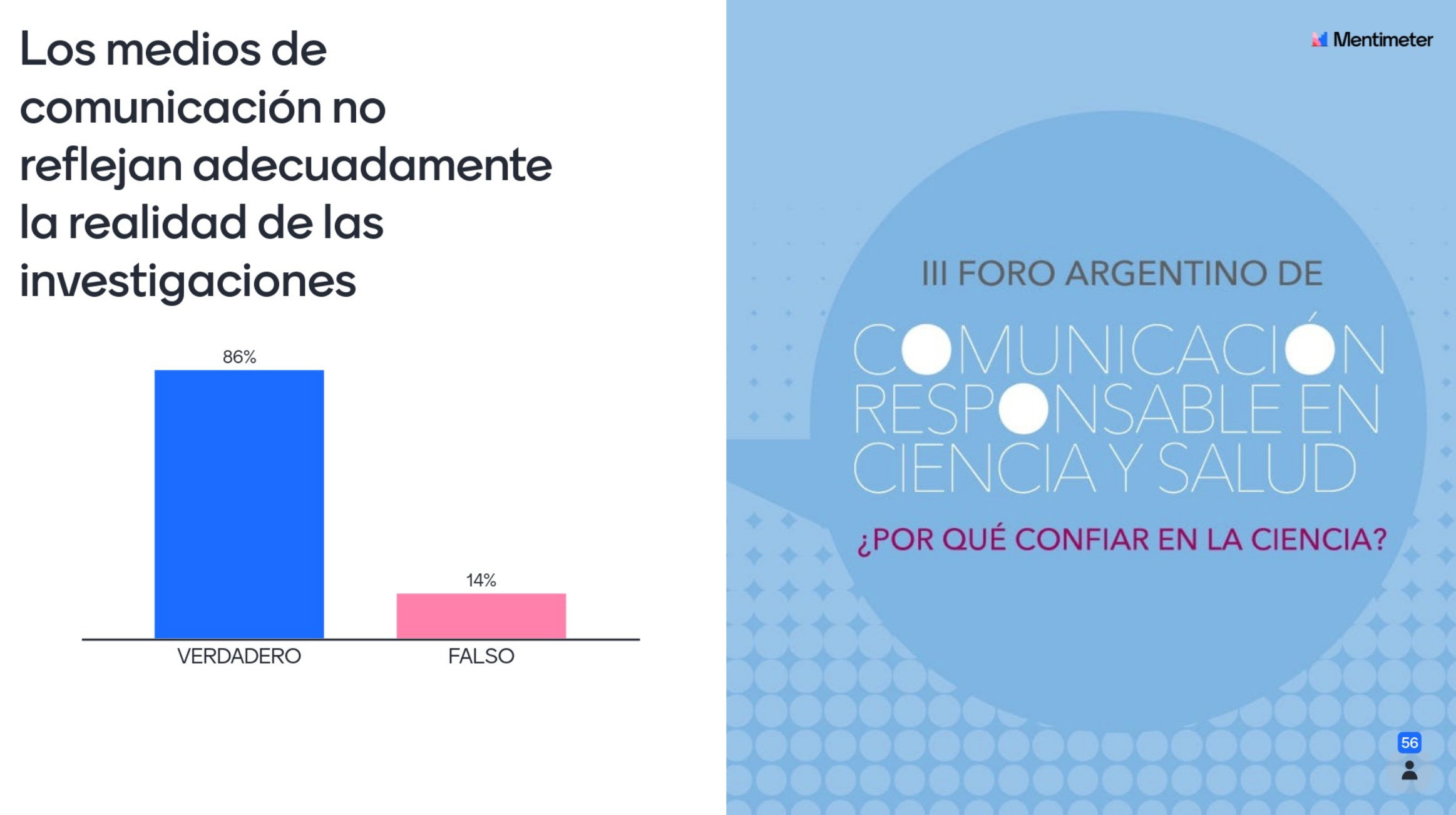 - Las siguientes opciones eran por verdadero falso. 86% de las personas que respondieron dijo que es verdadero que “Los medios de comunicación no reflejan la realidad de las investigaciones” y 14% opinó que esta afirmación es falsa. Con respecto a la afirmación “Todo estudio tiene un interés económico por detrás”, un 24% respondió que es verdadero y un 76% que es falso.